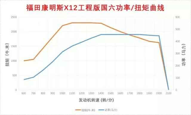 发动机扭矩输出曲线在低转速部分,每一段的上升都非常陡直,可以看出X12工程版爆发力强、提速快。在还从不到1000rpm的时候,扭矩就大于2000牛.米,最大扭矩转速区间广。